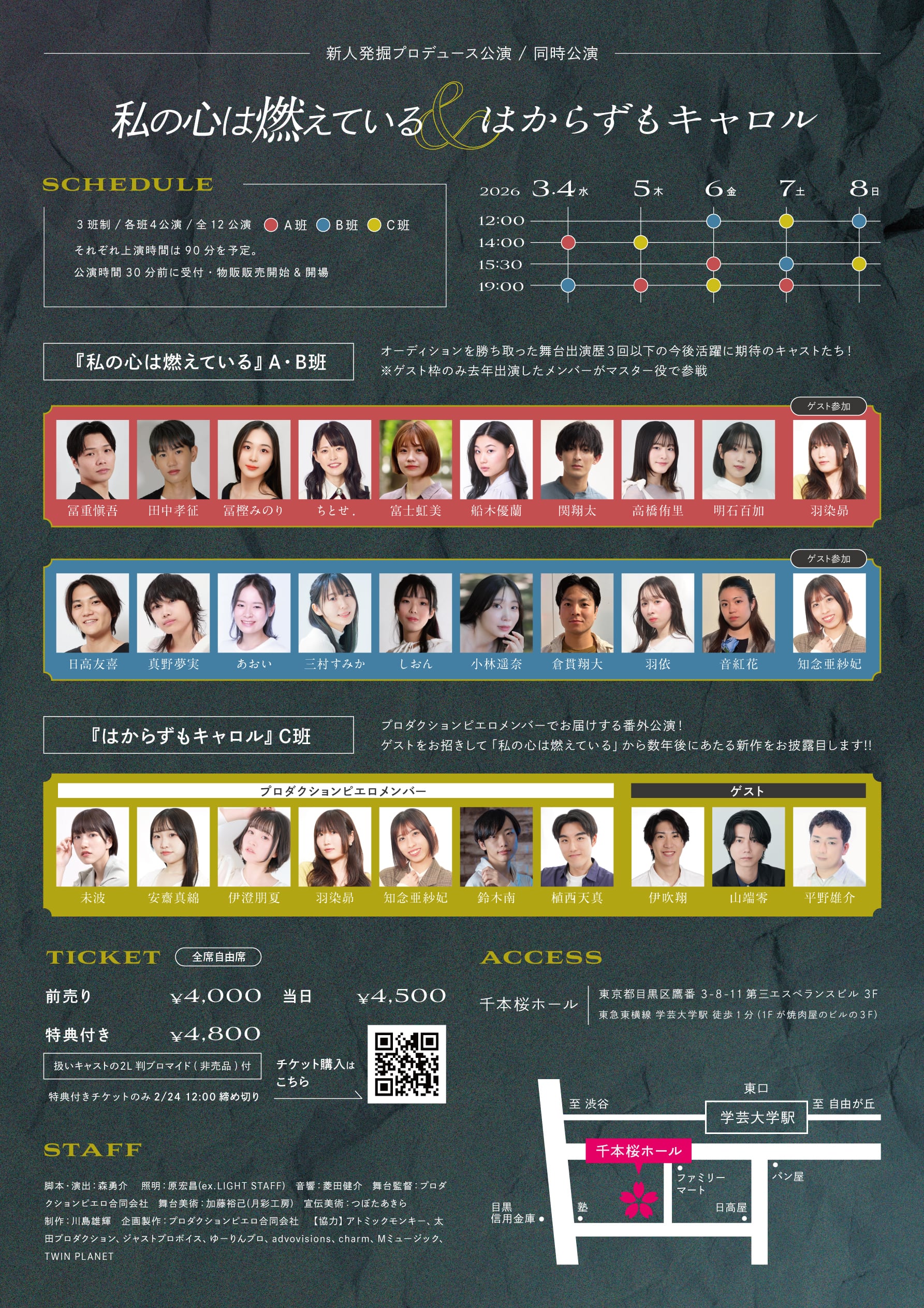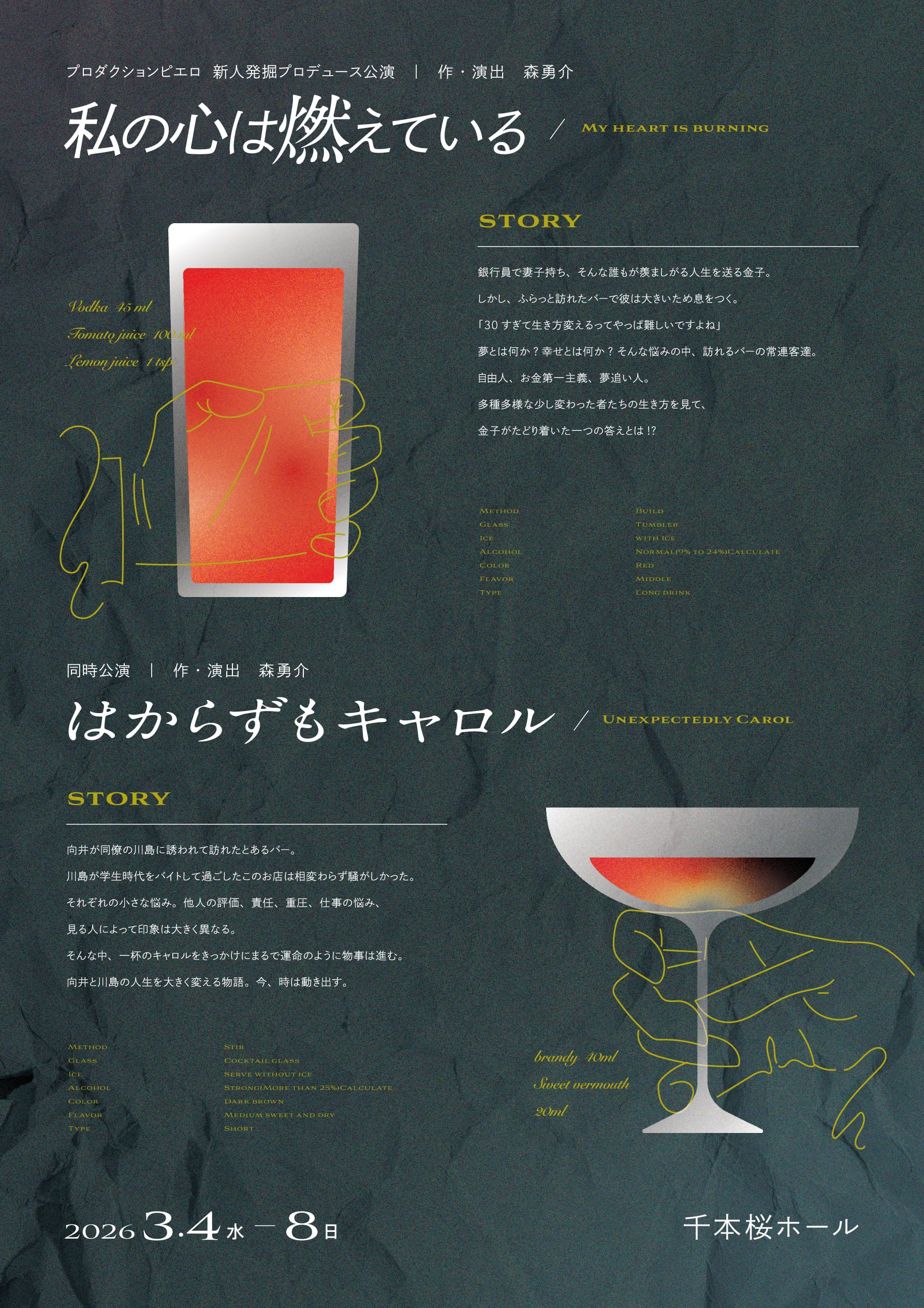舞台「私の心は燃えている」「はからずもキャロル」の上演台本となります。